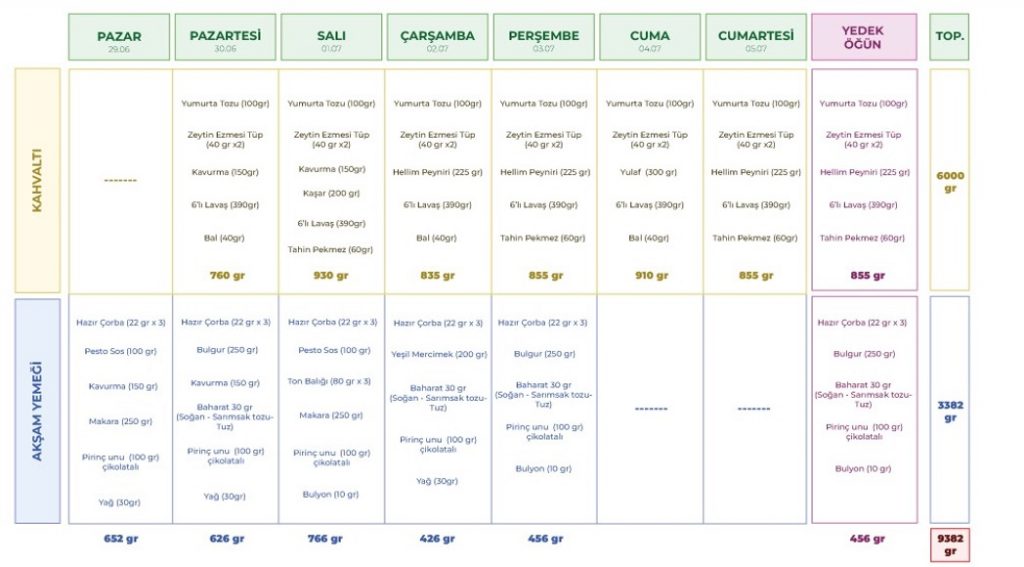 Kişisel yiyecekler:15 tane protein barlar ve çikolatalar, fıstık ezmesi(plastik), Kuruyemişler,Kek, pekmez