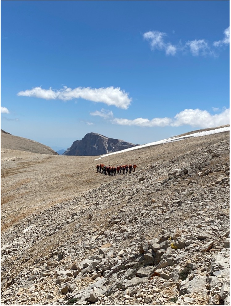 Zirvede rüzgar çok kuvvetliydi. Süre tanındı; protein barlarımdan yedim, suyumu içtim ve soluklandım. Sonrasında bölge tanıtımı yapıldı. Geri döndük, katmanlarımızı çıkardık, çantalarımızı sırtladık, tek sıraya geçtik fakat burada verilen süreye geç kaldık. Trans faaliyeti kapsamında bu gecikmenin hoş karşılanmayacağı belirtildi. Karagöl kamp alanına doğru yürüyüşümüze devam ettik. 14.26’da 15 dakika mola verdik. 15.53’te kamp alanına ulaştık.