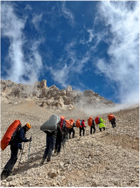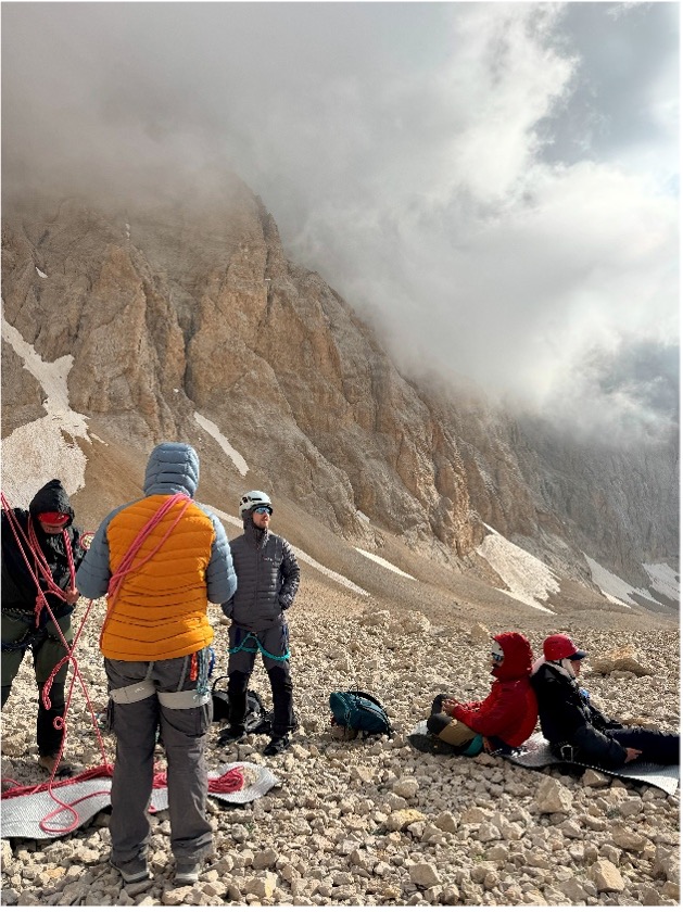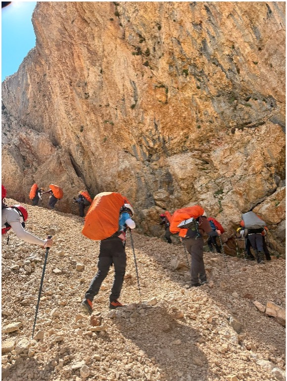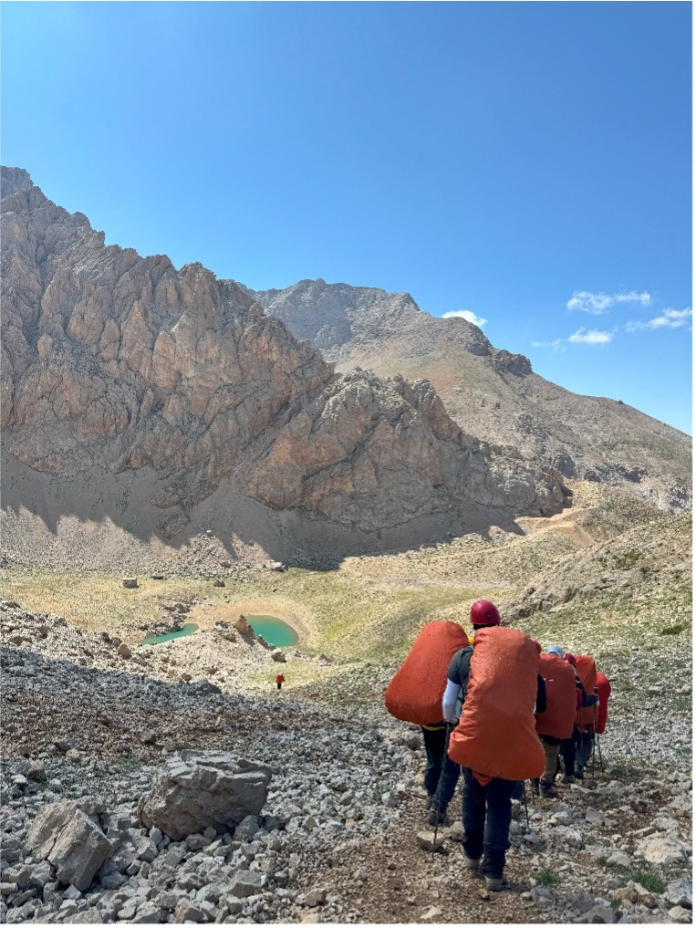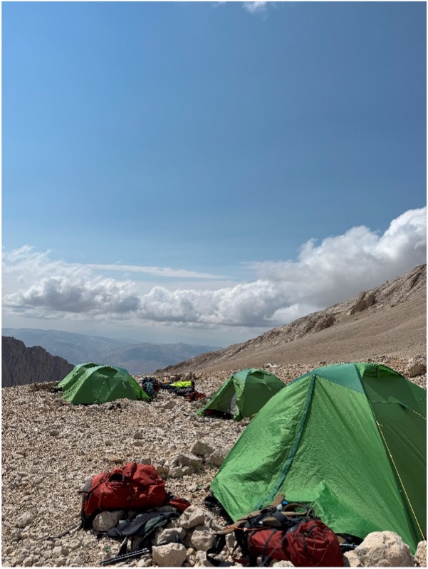 Cumartesi, 28.06.2025 tarihinde saat öğlen 12.00’de çantalarımızı kontrol ettirmek üzere Davutpaşa Kampüsü’ne geldim. Çantalarımızı serdik ve kontrol edildiler. Bana yapılan eleştiri; kuruyemişimin yeterli olduğu ancak bu yeterliliğin abur cuburlar açısından sağlanmamış olduğuydu. Ayrıca yanıma büyük bir mont ve yağmurluk almıştım. Bana ikisinden birini bırakmam söylendi fakat ben ikisini de yanıma aldım. Çünkü okuduğumuz faaliyet raporlarında ve duyduğumuz kadarıyla dağ, koşulları çok değişken ve soğuk olan bir yerdi. Bunun üzerine markete gidip 8–10 tane daha çikolata aldım. Birlikte yemek yedik ve daha sonrasında Gar’a gidip saat 19.00’da Niğde otobüsüne bindik. Otobüste uyuyamadım, rahat değildi. 04.50’de Niğde Otogarı’na vardık ve kahvaltı ettik. Getirdiğim yumurta ve keki burada çay eşliğinde yedim. Saat 06.06’da otobüse bindik. Otobüs yolculuğu yaklaşık 1 saat sürdü. Bu sürede de uyuyamadım. Saat 07.40’ta traktöre vardık ve 08.52’de Gelincik Kayaları’na ulaştık. 09.25’te yürüyüşe hazır olmamız istendi. 09.20’de yürüyüşe başladık. 09.49’da 5 dakika mola verildi. 10.52’de ikinci molamız, 12.28’de üçüncü molamız verildi. 13.40’ta kampa vardık. 16.00’da tek sıra olmamız istendi. Bu ilk kamp yerine olan yürüyüşte hiç zorlanmadım. Hatta bu raporun en kolay yürüyüşüydü benim için. Bazı arkadaşlarım yürüyüş sırasında irtifa hastalığına yakalandı. O an ne yaşadıklarını anlayamamıştım ama kampa vardığımızda çadırları kurmaya başladığımız an bir anda gözlerimin karardığını fark ettim. Sonra da baş ağrısı başladı. Daha önce hiç böyle bir şey yaşamadığım için irtifa hastalığı olduğunu düşünemedim. Yeterli sıvı almadığımdan kaynaklandığını düşündüm.