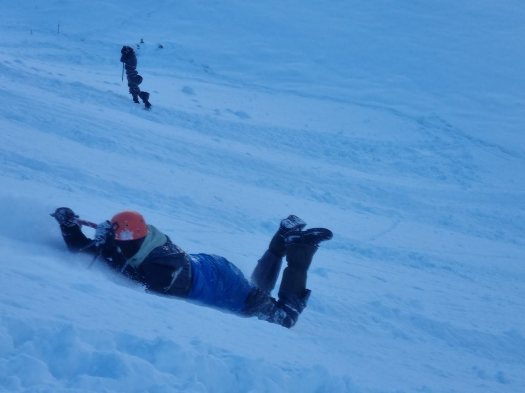 Kamp alanına vardığımızda saat 06.30’du. Saat 08.00’de poşetlenmiş bir şekilde tek sıra olmamız istendi. Çadırlara geçip çadır arkadaşlarımla uyumanın mantıksız olduğunu düşündüğümüz için kahvaltı yapmaya karar verdik. Kahvaltımızı ettikten sonra kar erittik. Bu sırada hepimize bir yorgunluk çöktü ve 15 dakikayı geçmeyecek şekilde şekerleme yaptık. Daha sonra kalkmamız çok zorlaştı ama başardık. Saat 07.30’da poşetlenmeye başladık. 08.00’de tek sıraya geçip eğitim için açılan pistlere yürüdük. Önceki gün öğrendiğimiz düşüş tekniklerini karışık şekilde tekrarlamaya başladık. Ben en zorlandığım sırtüstü baş aşağı tekniğine ağırlık verdim fakat yine de eğitim boyunca kendimi güvende hissedecek kadar yol katedemedim. Saat 10.50’de kazma düşüş eğitimi bitti ve 12.00’ye kadar mola verildi.