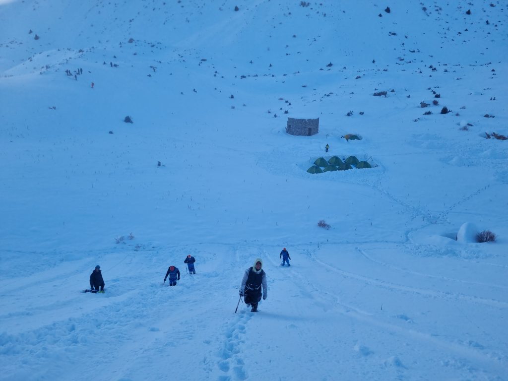 Tek sıra olmak için belirlenen vakitte yetişemedik. Birkaç dakika sonrasında yürüyüşe başladık. Yürüyüşe başlamamız çok olmamıştı ki battığım kardan çıkmaya çalışırken burkmuş olduğum ayağıma fazla güç uygulayıp ters bastığım için ayağımı yine incittim ve yürüyüşe devam edemedim. Alpdeniz ile yavaş yavaş ve sık sık duraklayarak kampa geri yürüdük.