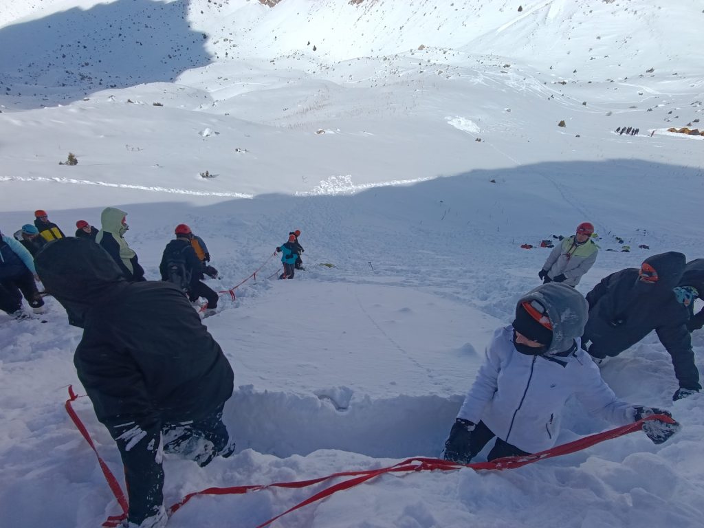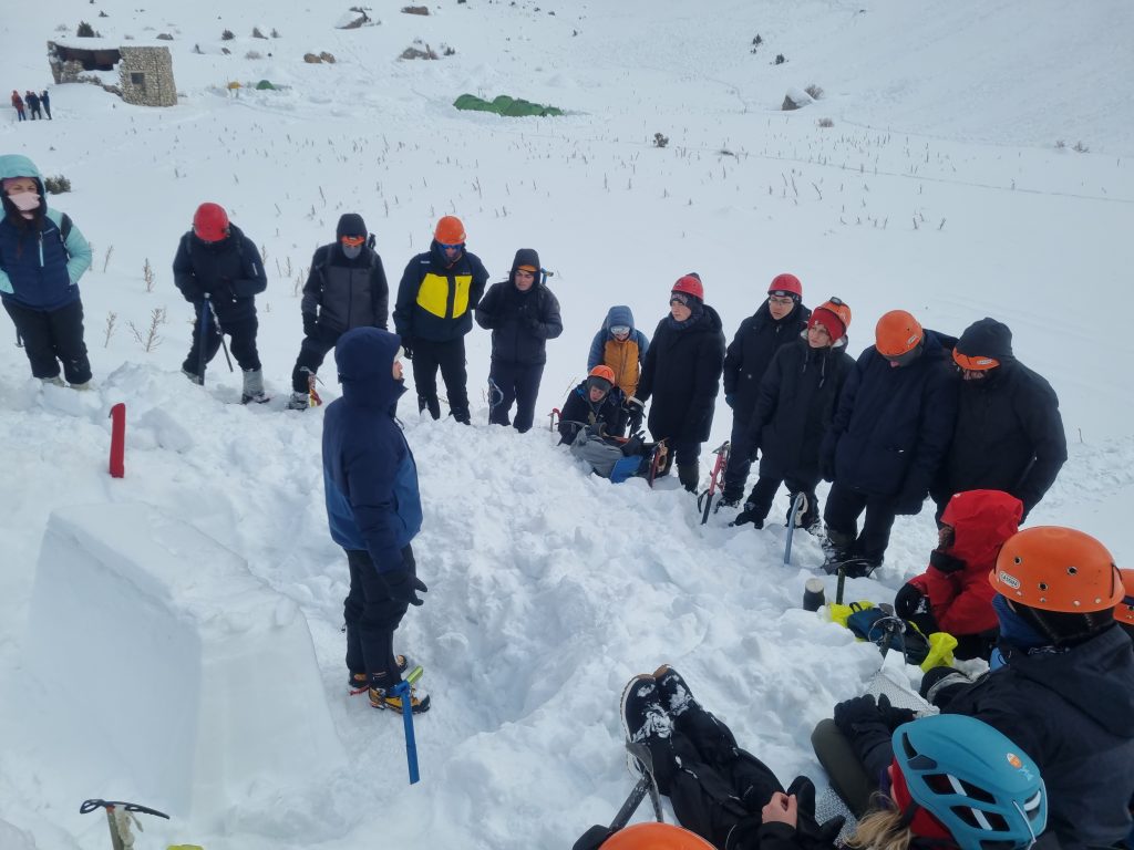 1 saatlik molanın ardından kar emniyet aletleri dersinde başladık ve eğitmenlerden Halit Tekinyer bize sırasıyla V-plaka, T-profil, tek ve çift yürüyüş kazmasıyla nasıl deadman yapılacağını ve küçük ve basit bir kar babası yapımını anlattı. Ardından gruplara dağıldık ve biz de sırasıyla grubumuz olarak tüm aletleri bireysel olarak denedik. Tüm aletleri önce grup olarak tek tek kontrol ettik ve sonrasında bir gelişime kontrol ettirdik. T-profili hepimiz dik denediğimiz ve kar yumuşak olduğu için başaramadık ancak başka bir grup T-profili yatay bir şekilde kazma gibi gömüp sağlam bir şekilde test etmeyi başarabilmişler. Eğitimin sonuna doğru kar babası yapmak için toplandık ve 3 gruba ayrıldık. Grubumuz olarak bir bölge belirleyip kar babamızı yapmaya başladık. Yaklaşık 3 metre çapa sahip ve at nalı şeklinde yapmamız gerekiyordu. Sonrasında sırasıyla tüm grupların kar babası test edildi. Önce kar babaları yorumlandı ve sonrasında ilk başta yapan grup sonrasında herkes birlikte kar babaları çekildi. Yaptığımız Kar babasında perlonların uzandığı düz kısım yarım dairemsi kısıma çok köşeli bağlanıyordu o yüzden o kısıma yük daha fazla bindi. Test ederken o kısımdan itibaren perlonlar içeriye girdi ve çok fazla yük uygulanınca da parçalanmaya başladı. Eğitim 15:45’te bitti ve sonrasında 17:30’a kadar yemek molası verildi.